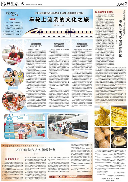 10月3日,《人民日报》以“车轮上流淌的文化之旅”为题,对全国多地文化主题列车创新实践进行专题报道,重点介绍汉景帝阳陵博物院联合中国铁路西安局集团有限公司打造的“高铁流动博物馆”活动。