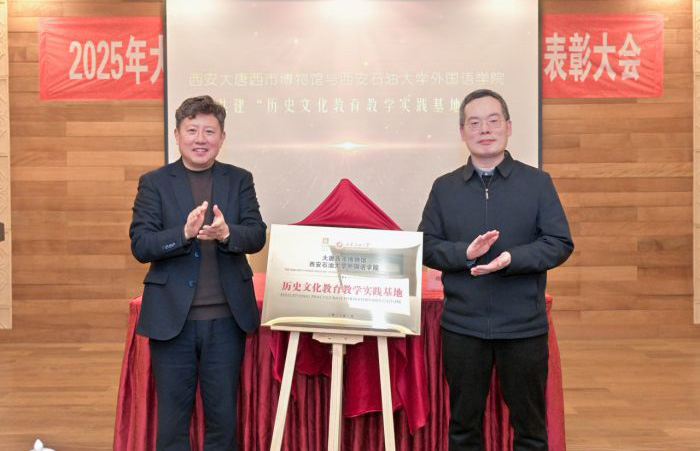1月10日,西安大唐西市博物馆召开2025年度志愿者总结表彰大会暨共建“历史文化教育教学实践基地”揭牌仪式,大唐西市博物馆、西安石油大学外国语学院、西安工程大学人文社会科学学院相关负责人和优秀志愿者代表100余人出席活动。